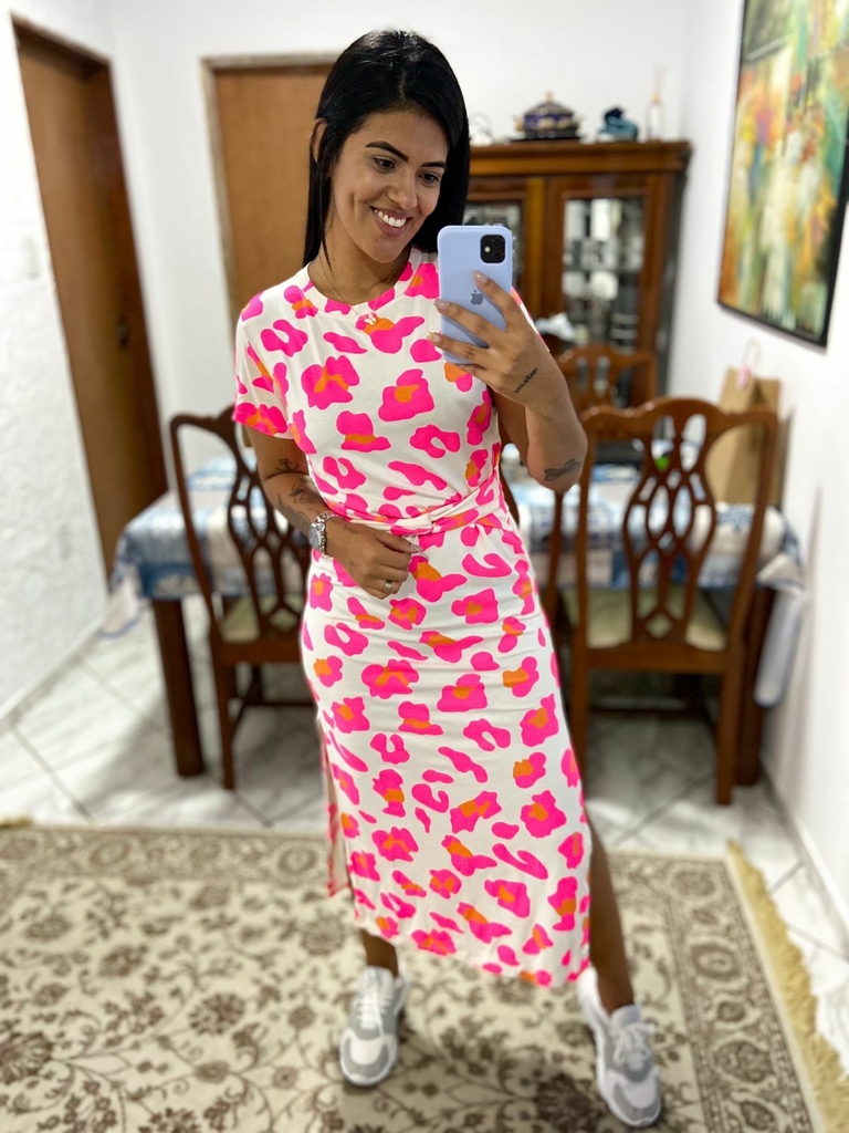 O vestido é modelo Midi no tecido malha viscolaycra( tecido estica), de manguinha, decote redondo, não possui bojo, e contém amarração na cintura.